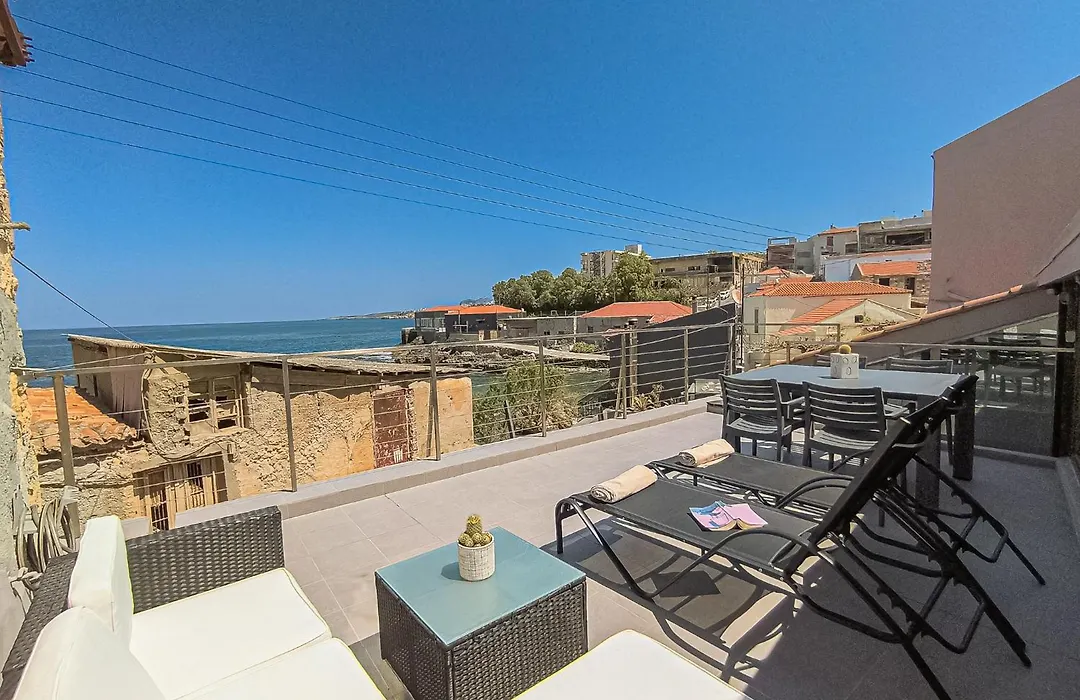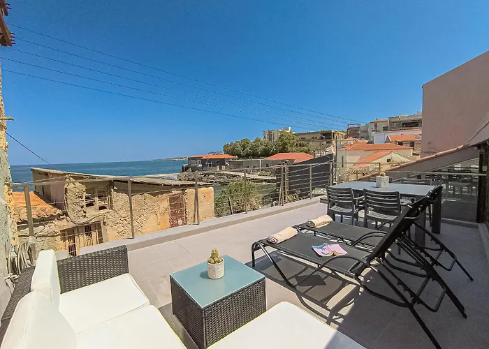 Situata a 2 km dal Museo Archeologico di Chania, Charming Old Tannery House With Spacious Veranda And Stunning Sea View! offre un patio con vista sulla città.